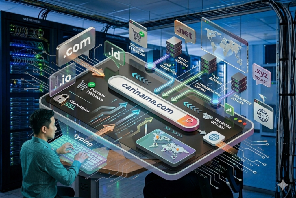 Domain adalah nama unik yang memudahkan akses website yang berperan sebagai alamat dengan menggunakan, sedangkan hosting adalah layanan sewa ruang server (penyimpanan data) untuk menyimpan file website agar aktif 24 jam. Keduanya bekerja bersama agar situs dapat diakses secara online kesimpulannya domain adalah alamat sedangkan hosting adalah rumahnya